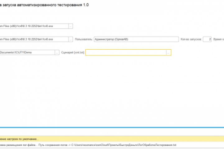 Инструкция: Перед запуском обработка предупредит, что автоматический запуск тестирования работает только с Файловыми ИБ, далее после запуска обработки необходимо заполнить поля настроек, для клиента тестирования и менеджера, указав пути к файлам запуска 1c, а так же указать путь к каталогу ИБ в которой будет проходить тестирование и путь к файлу сценария (xml, txt или любой текстовый формат), обработка сама разбирает файл xml (за основу взять механизм разбора из обработки ИТС – > \UILogToScript_83). После того как все поля заполнены – необходимо нажать кнопку "Тест", если все поля заполнены верно – начнется тестирование, если нет – будет показано соответствующее сообщение. Обращаю внимание, что в процессе работы обработка будет создавать вспомогательные файлы, в том, числе др. обработки, которые будет использовать Менеджер тестирования, во время чего могут появляться сообщения платформы об опасных действиях, необходимо на запрос открытия обработок – ответить утвердительно.