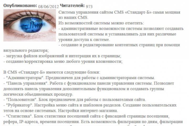 Система управления сайтом CMS «Стандарт-Б» предназначена для организации работы с контентом сайта, посетителями, организации рекламных компаний и пр.