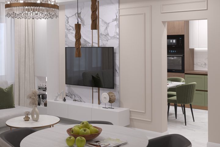 Интерьер кухни и гостиной в стиле неоклассика.