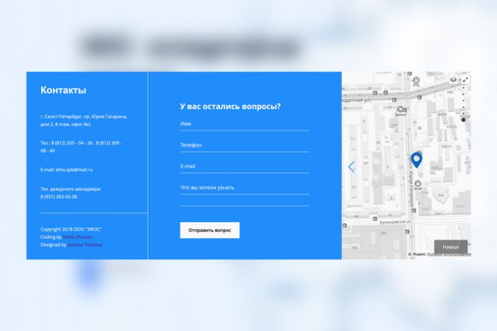 Форма обратной связи с обработкой на сервере и отправкой данных на почту (в Telegram) по желанию. Показ/скрытие на JQ для дополнительного места с картой. Присутствует маска для ввода tel. На сервере обработка через PHP-mailer. Отправка данных через AJAX без перезагрузки страницы.
