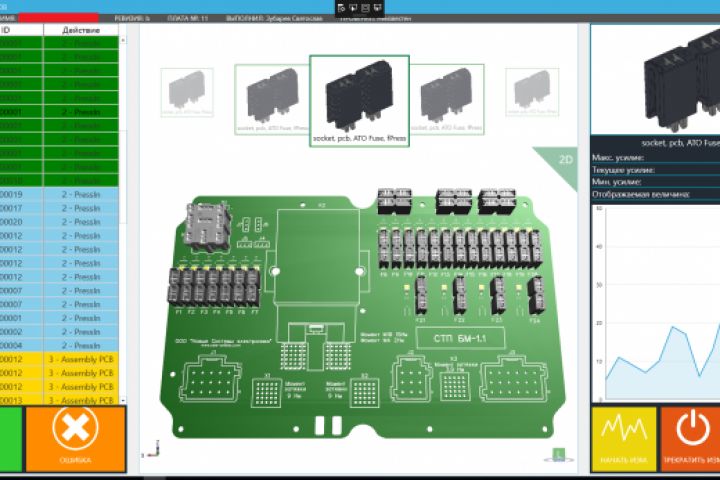 Прикладное ПО для работы на производстве. Этап производства состоит из 4х стадий: установка SMD-компонентов, установка Press-fit-компонентов, поверхностный монтаж, окончательный монтаж. При работе на той или иной стадии, оператору указывается необходимая информация по установке конкретного компонента. (местоположение компонента, его datasheet или информация по усилию нажатия (для Press-fit), получаемая с датчика в реальном времени). Данные по выполнению записываются на MySQL-сервер. В процессе работы оператор может посмотреть прогресс выполнения в виде 3D-модели, статистику по конкретному проекту, открыть окно измерений датчика. Приложение создано по технологии WPF, паттерн MVVM. Приложение ориентировано как на работу с сенсорным дисплеем, так и на работу с использованием классических манипуляторов. Работа над приложением не окончена, представлен предварительный вариант.