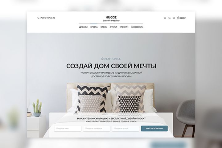Landing Page по продаже мебели Hugge Scandi Interior. Скандинавский стиль характеризуется простыми линиями, светлыми тонами, спокойной гаммой. Сайт должен создавать впечатление уюта и домашнего тепла.