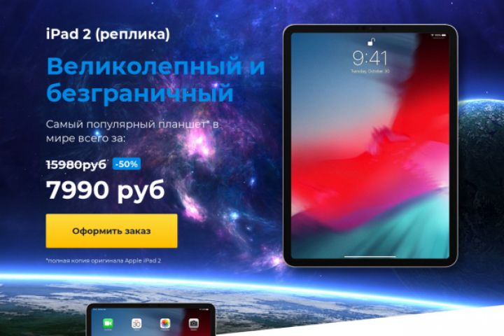 Нарисовали дизайн, сверстали макет и разработали техн. составляющую LP c элементами интернет-магазина по продаже iPad 2. С помощью запуска данного лендинга заказчик повысил конверсию на 9%.