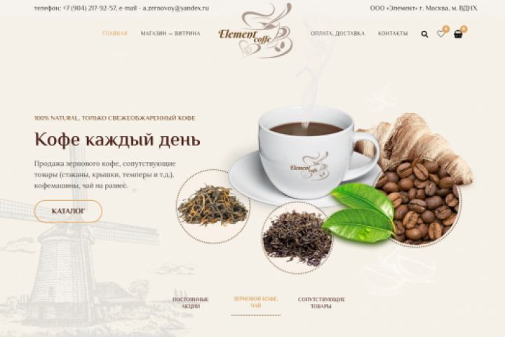 Магазин зернового кофе собственных рецептов Полностью "под ключ" с изготовлением элементов графического дизайна, логотипа, картинок, иконок и т.д.