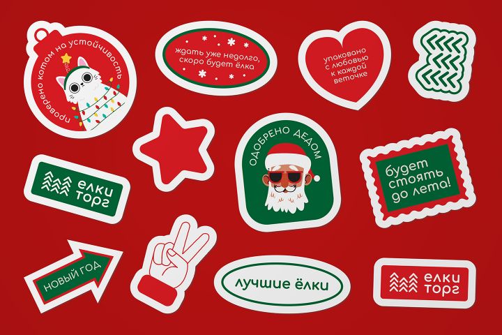 Поскольку клиенту было важно сохранить годами формировавшуюся узнаваемость бренда ЕлкиТорг, мы решили оставить основные цвета: красный и зелёный. И главной фишкой редизайна стал не новый логотип, а так называемый стикер-брендинг.