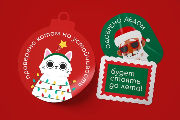 Элементами обновлённой айдентики стали стикеры с образами кота, проверяющего ёлку на прочность, провокационных лозунгов («будет стоять до лета!»), цитат из песен («ждать уже недолго, скоро будет ёлка!») и прочих новогодних элементов. Стикеры используются как комплексно (например, для брендирования больших поверхностей), так и по отдельности. Такой подход к оформлению фирстиля сильно выделяет компанию на фоне конкурентов.