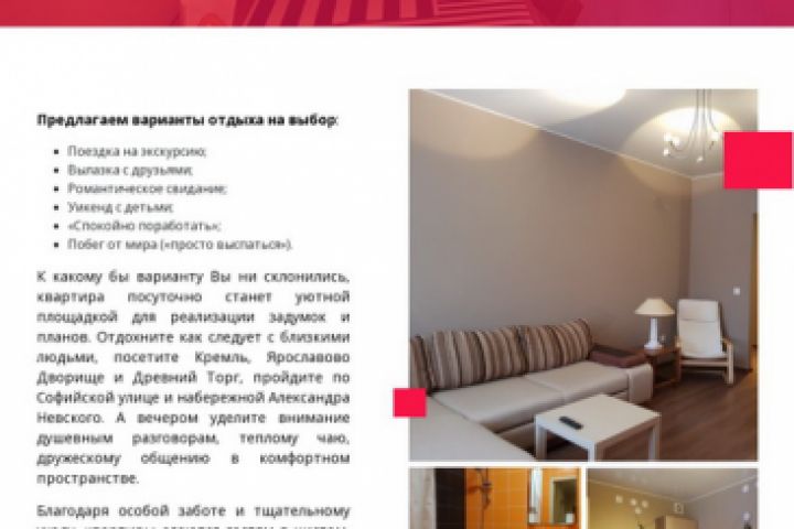 Сайт посуточного бронирования квартир. Сделан в адаптивной верстке с анимацией. Имеется интеграция со сторонними сервисами бронирования апартаментов (booking.com, airbnb.ru и др.).