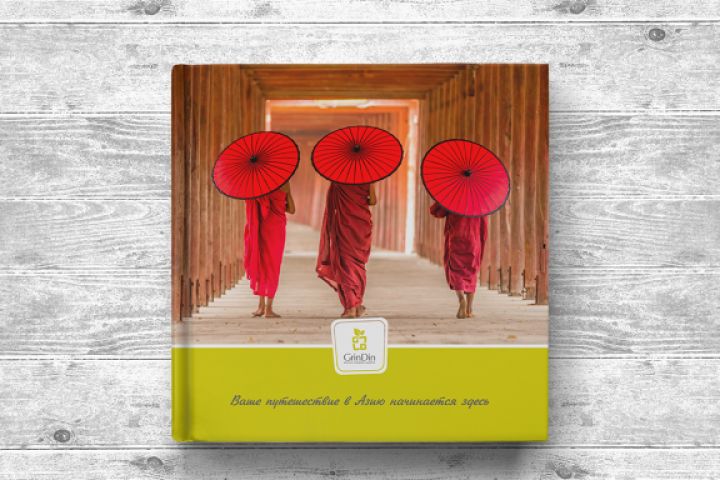 Буклет в пан-азиатском стиле для клиентов компании GrinDin, которые купили программу «Путешествие в Азию». Имеет информационно-развлекательный характер. Каждый разворот посвящен одному азиатскому блюду с указанием страны, в котором впервые появилось.
