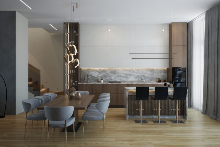 Полный дизайн-проект Таун-хауса в поселке Парк Фонте (Новая Рига). Помещение для постоянного проживания семьи с 2-мя детьми .Разделение пространства по этажам- этаж общая зона(гостиная и кухня),второй этаж-для детей,третий-для родителей,с организацией раздельных кабинетов и возможностью работы из дома.Оформление эксплуатируемой кровли и террасы