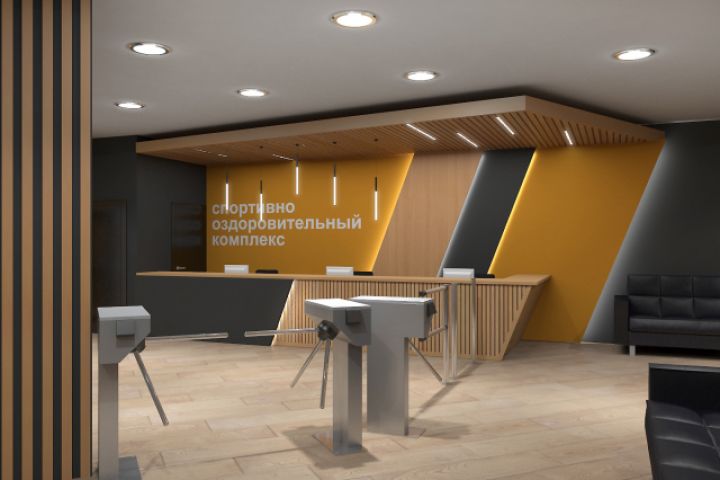 Дизайн-проект холла спортивного центра в фирменных тонах , с использованием экологической темы