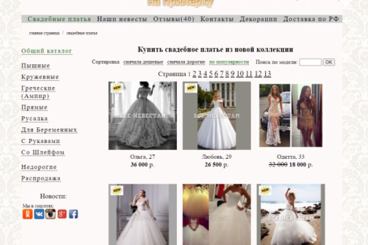 Изначальные требования - каталог свадебных платьев с сортировкой по фасонам и по цене.