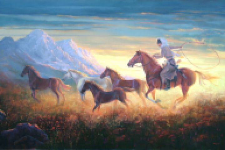 Вот они живо пробежали трусцой. Юноша на коня не садится, бежит рядом, на бегу поглаживая его по гриве, по спине. Так они вместе обегают кругом широкий луг. Лишь тогда юноша без всякой узды, без седла, вскакивает на жеребца, разводит в стороны руки и издает жизнерадостный клич. Тогда уже и конь дает свободу своему страстному, порывистому сердцу, резвым ногам, и, вытянувшись во весь рост, почти прижимаясь к траве, мчится во весь опор. И так они скачут с наслаждением, пока не успокоится их восторг, несколько раз огибая луг. Потом, остановившись возле родника Муллахмета, юноша легко спрыгивает на землю. Делает у ручья утреннюю гимнастику. А конь пасется неподалеку, время от времени поднимая голову и поглядывая на своего товарища, а порой и сам бьет передними копытами по земле.