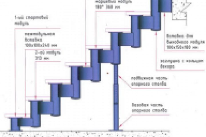 Модульная лестница состоит, как правило, из трех частей. Нижний модуль – это элемент, крепящийся к полу, он является основанием всей конструкции, благодаря ему, лестница сохраняет устойчивость. Средний модуль - это элемент, на котором закрепляются ступени будущей лестницы. Именно от количества средних модулей зависит длина лестницы. Верхний модуль выполняет функцию крепления лестницы к стене или межэтажному проему.