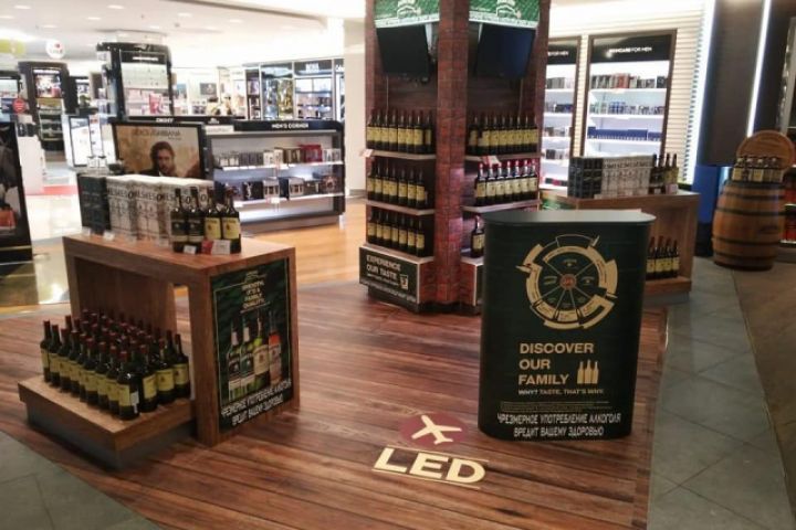 Изготовление мебели и декораций для ЛЕД Аэропорт Пулково - тумбы из МДФ с оклейкой самоклейки, промо стол, напольный стикер с усиленной ламинацией 255 мкм.