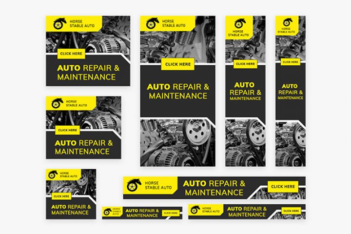 Дизайн баннеров в фирменных цветах компании по ремонту автомобилей.