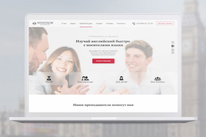Нужен рекламный сайт целью которого является сбор контактных данных. Особенность этой школы — обучение с носителем языка. Есть возможность пройти пробный урок. Есть много различных направлений для изучения.