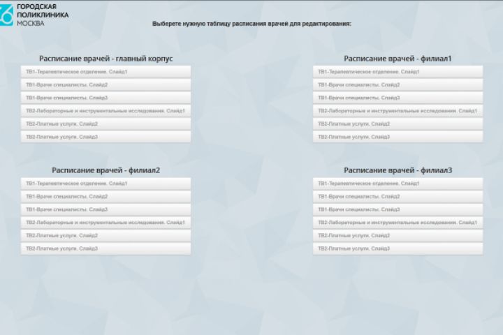 В данном варианте «Расписание врачей» было сделано для четырёх филиалов Городской поликлиники №46 ДЗМ (вёрстка сделана под мониторы поликлиники).