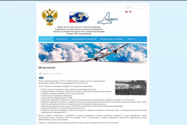 Разработка и поддержка сайта (на платформе «Joomla!») для филиала "НИИ Аэронавигации" ФГУП Гос НИИГА.