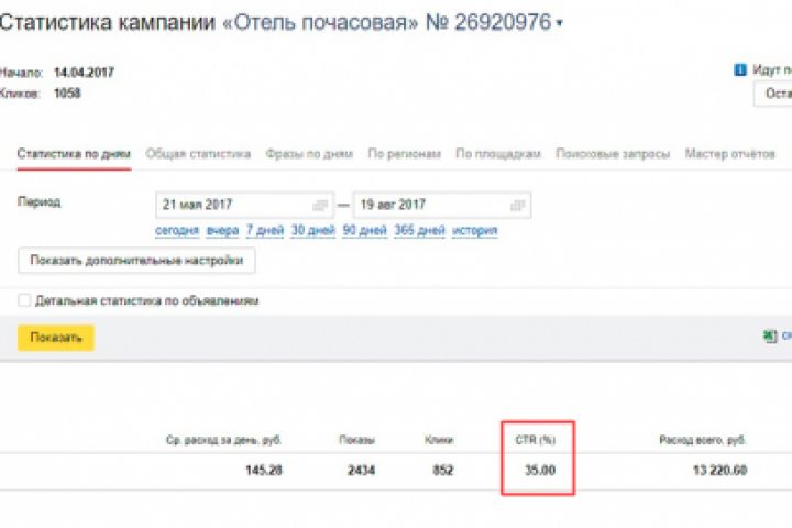 Пример разработки кампании для одного клиента - отель в ЮВАО Москвы с почасовой и посуточной оплатой. Данный мини-отель наполняется посетителями благодаря контекстной рекламе в Яндекс.Директ, Google AdWords не запущен. По факту заполнения мест в отеле владелец останавливает кампании. Статистика за 3 месяца на скриншоте