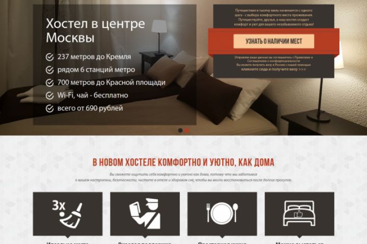 Лендинг хостела Кремлевские Огни. HTML + PHP + встраивание сервиса букинга WuBook, модифицированная премиум HTML тема.