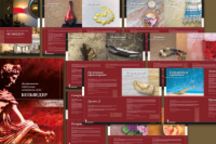 Буклет для серии декоративных покрытий «Бельведер», Был разработан фирменный стиль, логотип, этикетки на банки с краской и т.д. В буклете созданы иллюстрации, коллаж из объектов на фоне того или иного покрытия.