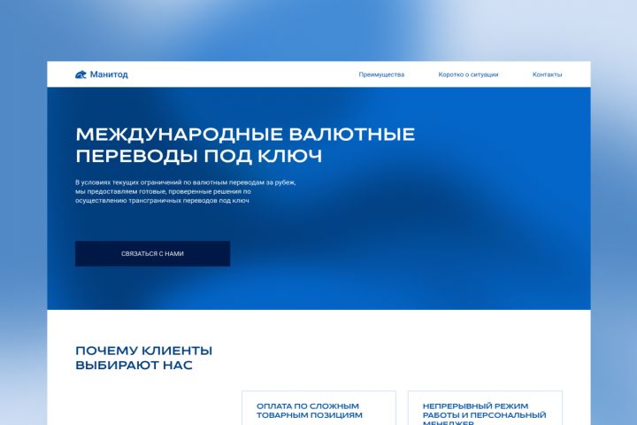 Необходимо было сделать в минималистичном стиле сайт для компании, которая замается международными валютными переводами. В палитре использовались фирменные цвета компании. Структура сайта проста и интуитивно понятна пользователю.