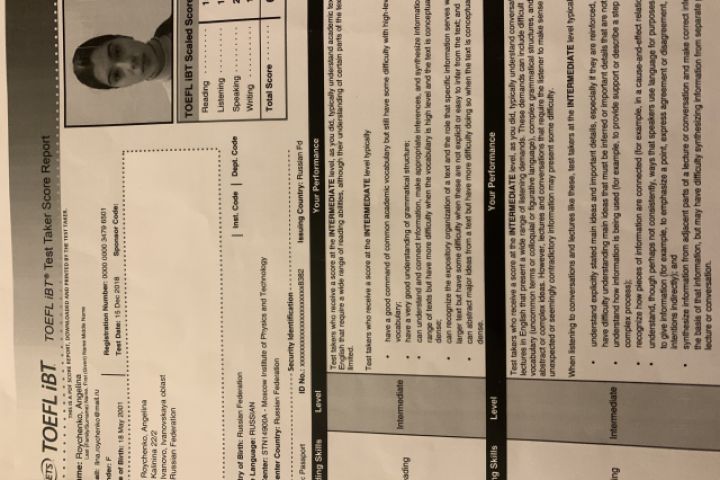 В 2019 году поступила в Long Beach City College в Los Angeles. В первом триместре оценки все A. Уровень английского Upper Intermediate. Свободно разговариваю, хорошо перевожу.