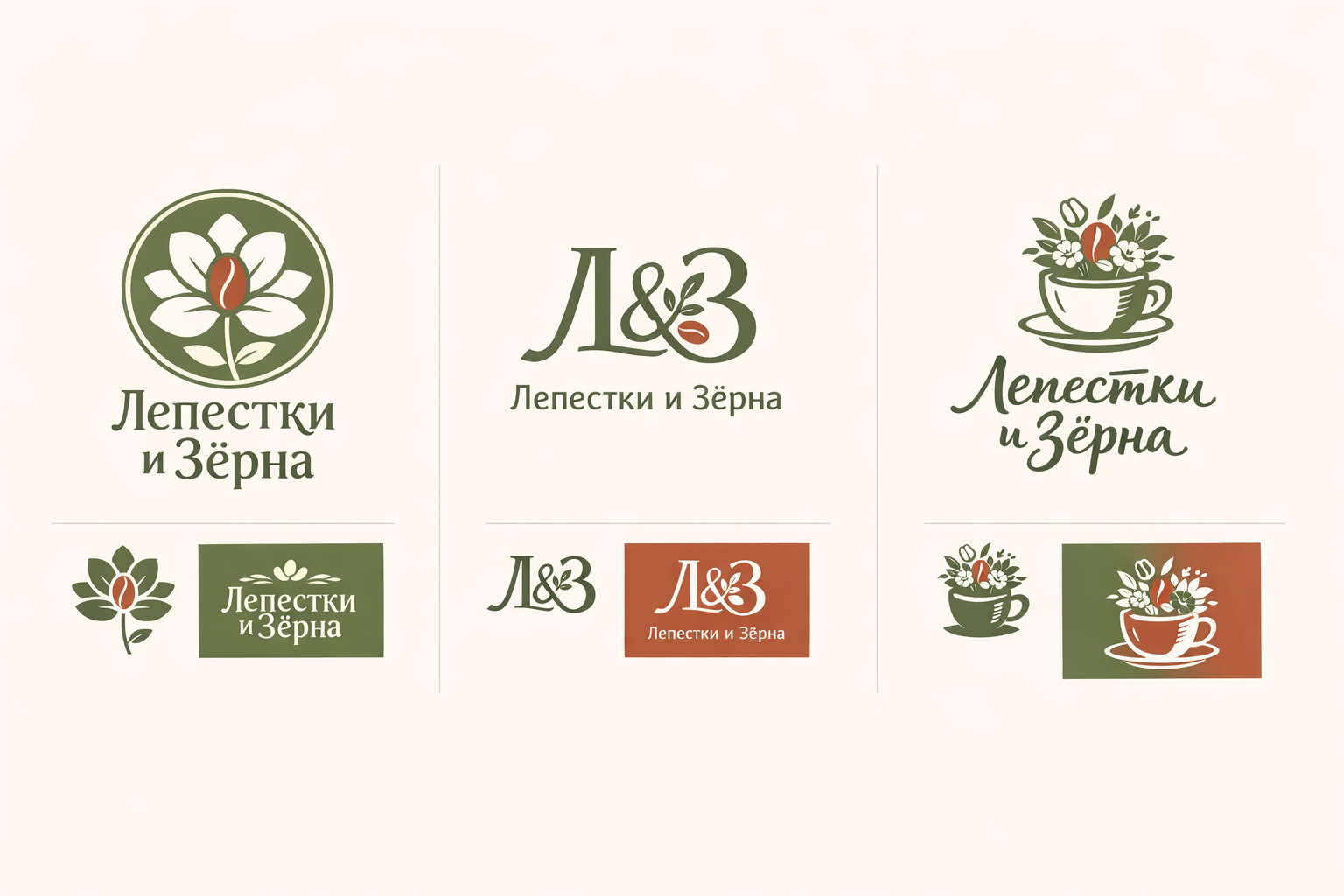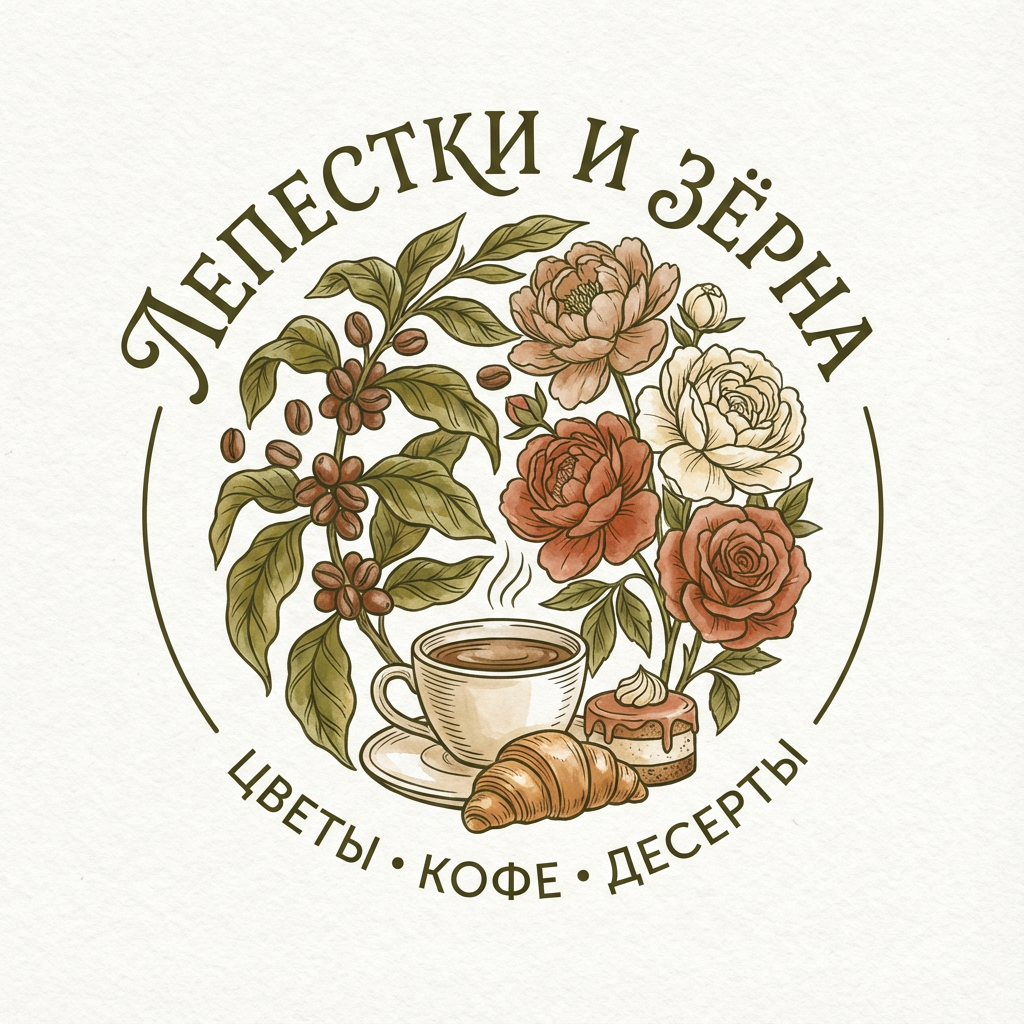 Разработать логотип для цветочного магазина и кофейни с кухней (один совместный проект в одном помещении). Название в логотипе "Лепестки и Зёрна". В кофейне различные десерты, напитки и кухня с завтраками и простое меню (бранчи). Желаемая цветовая гамма - можно рассмотреть разные сочетания, но в основе нужен зеленый (преимущественно оливковый, т.к он будет сочетаться с любым букетом, кофе), терракотовый. Логотип будет размещаться на входной группе магазина, на упаковочной бумаге и упаковочных коробках для цветов и десертов/еды с собой, на флористических лентах, наклейках, стаканчиков для напитков, соц.сети, карты, мессенджиры и т.д. Целевая аудитория - люди от 20 до 50 лет, молодые семьи с детьми. Пожелания: что-то понятное и читаемое на русском языке, желательно не просто надпись и название, а какая-то индивидуальная символика, которая будет как якорение для глаз.