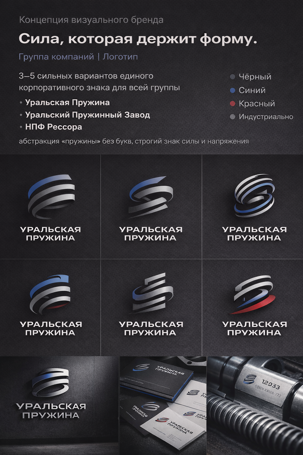Необходимо придумать визуальную концепцию Бренда под одним графическим символом. Продвигаем 3 предприятия: 1. ГРУППА КОМПАНИЙ – «Уральская Пружина» 2. «Уральский Пружинный Завод» 3. «НПФ Рессора» Основные цвета: Черный, Синий, Красный. см на сайте. Ценовой сегмент. Массовый, шкала выше среднего. «Уральский Пружинный Завод» и «НПФ «Рессора» Производитель пружин горячей и холодной навивки из заготовки диаметров от 0,1 до 70 мм и рессорное производство со сквозным технологическим процессом. Рынок присутствия продукции и потенциальный рынок. Рынки упругих компонентов России и экспорт. Проектирование и производство пружин более чем для 20 отраслей: Сельскохозяйственной, Железнодорожной, Автопрома, Пищевой, Строительной, Мебельной, Электротехнической, Приборостроительной, Агрегатной (грохоты, дробилки), Нефтепромысловой и буровой, Лифтостроительной, Индустриального транспортного оборудования, Котельной и теплообменной, Пружины для детских игровых комплексов, Рессорная продукция. Главные конкуренты и их позиционирование • Русметмаш Подольск • Завод Пружин И Металлоконструкций Охта Санкт-Петербург+ • Спринг Альянс НН • Димитровградский Пружинный Завод Димитровград • НПЦ Пружина Ижевск • Ппрз Пермь • Производственная Компания Пружинный Проект Казань+ • БЗРП Белорецк Основные смыслы, транслируемые предприятием: Безопасность, Целеустремленность, Партнерство Надежность, Развитие. Основные ценности на ваш взгляд при коммуникации с клиентами, партнёрами: • Уважение и ответственность • Законность, гражданская позиция и социальная ответственность • Профессионализм, развитие и самосовершенствование • Качество • Сотрудничество и открытость Для партнёров • Цели долговременного сотрудничества • Высокая финансовая устойчивость Для персонала • Безопасные условия труда • Доход среднего класса Для общества • Точка добра • Полная уплата налогов Основные каналы дистрибуции • Основная реализация в канале в2в, как компоненты, для узлов и агрегатов, конечным производственным предприятиям. • Серийная продукция для: автопрома и сельского хозяйства. Реализуется по всем каналам сбыта: в производство сборочных предприятий, а также, как компонент, для вторичного рынка зап. частей. География продаж - Россия, Казахстан, Беларусь, Турция, Чехия , Германия