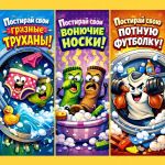 Необходимо разработать оригинальную, шуточную этикетку размером 120х160мм. для геля для стирки. Этикетка должна быть шуточной, с иллюстрациями и текстом. Сопроводить яркими красочными иллюстрациями) 1. ПОСТИРАЙ СВОИ ГРЯЗНЫЕ ТРУХАНЫ 2. ПОСТИРАЙ СВОИ ВОНЮЧИЕ НОСКИ 3. ПОСТИРАЙ СВОЮ ПОТНУЮ ФУТБОЛКУ